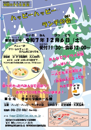 ハッピーハッピーランチ(子ども食堂) 2025年11月23日 お知らせ イベント ブログ by 手まり学園 担当者. 12/6(土) 手まり学園ホール棟にてハッピーハッピーランチ(子ども食堂)やっちゃいます。メニューは クリームシチューとスパムおにぎりです 。 参加費 小・中・高校生無料 大人300円 受付11:00~ 食事12:00~ ご飯の後はレクリエーションやおやつ作りを企画しています(自由参加です) 皆さんをお待ちしております。 前の記事